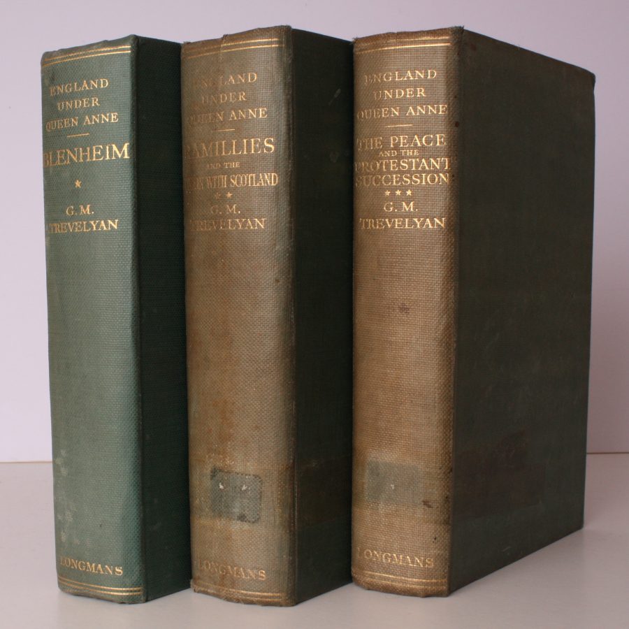 Sold from an institution with its bookplates, pockets and stamps on front endpapers. The trilogy comprises: Vol. I: Blenheim (new impression, 1930); Vol. II: Ramillies and the Union with Scotland (first edition, 1932); Vol. III: The Peace and the Protestant Succession (first edition, 1934). A sound working set. COMPLETE SETS ARE SCARCE.