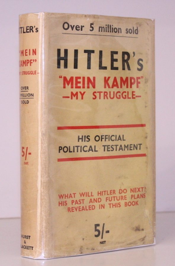 Published in December 1938 as the fourth impression of H&B's Library Edition (first impression thus October of the same year), successor to their Paternoster Library edition of October 1935. Hitler's infamous treatise was first published in English in an abridged form prepared by Dugdale in 1933, and this remained the standard text in English until Murphy's unexpurgated translation of January 1939. VERY SCARCE IN DUSTWRAPPER, AND ESPECIALLY SO IN THIS CONDITION. Pastore Stanik & Brewster 104b2.